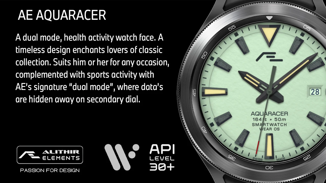 A dual mode, health activity watch face. A timeless design enchants lovers of classic collection. Suits him or her for any occasion, complemented with sports activity with AE’s signature “dual mode”, where data are hidden away on secondary dial.