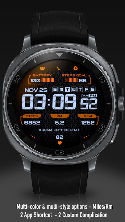 Functionality meets customization with a fully featured dashboard displaying essential health metrics, including real-time heart rate, step count, calories burned, and distance (with automatic support for both KM and Miles). The watch face offers versatile personalization options, allowing you to switch between multiple vibrant color themes to match your style. It also features two custom complications and app shortcuts to keep your schedule and favorite tools just a tap away. optimized with a battery-friendly Always-on Display (AOD) mode, this face is the perfect daily driver for Wear OS users.