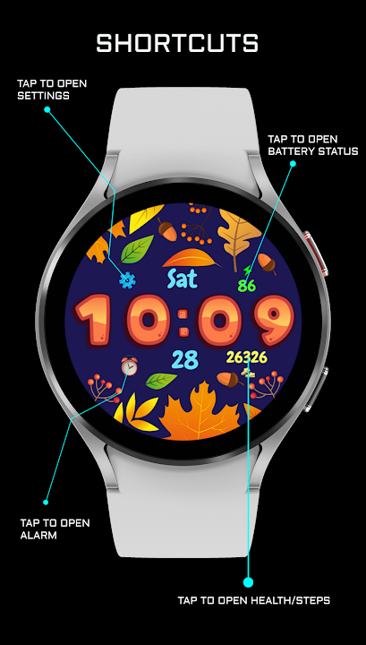 - Alarm, Settings, Battery Status and Steps App shortcuts.