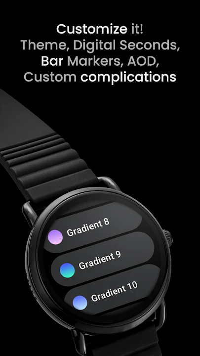 • gradient BAR indicators with 10 color styles (step goal + battery)