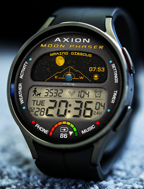 軸月月根據用戶設置的 12/24 小時時間計步器、心率報警快捷鍵月相三個自定義應用程序快捷方式設置快捷方式專為 WearOs 打造
