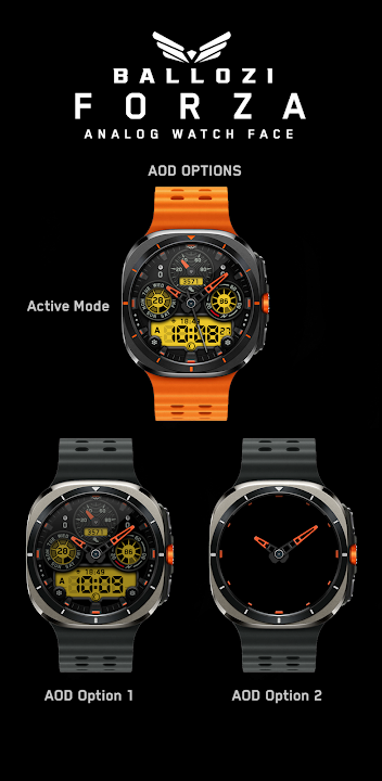 BALLOZI Forza is a modern retro sporty informative watch face for Wear OS. Created with a chronograph in mind with well placed standard LCD, informative and readable complication even in AOD.