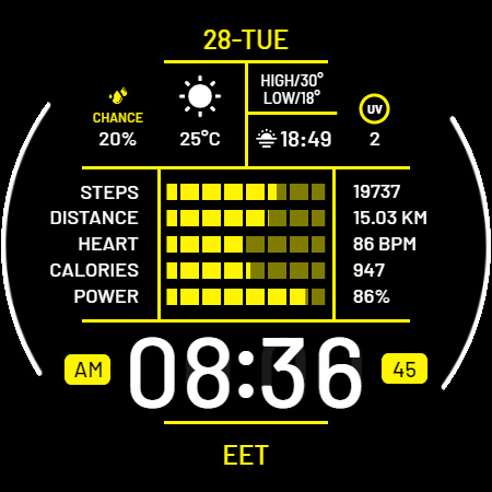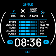 這款 Wear OS 錶盤擁有您所需的一切 - 數位時間、日期、電池電量、心率、步數、行駛距離資訊、天氣狀況和溫度、濕度資訊以及大量顏色選項。