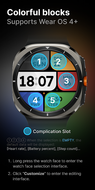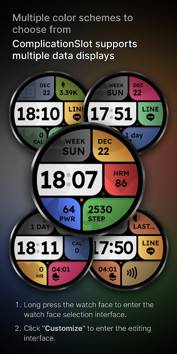 - 5 ComplicationSlots (default data displayed when EMPTY is selected: date, heart rate, steps, battery...)