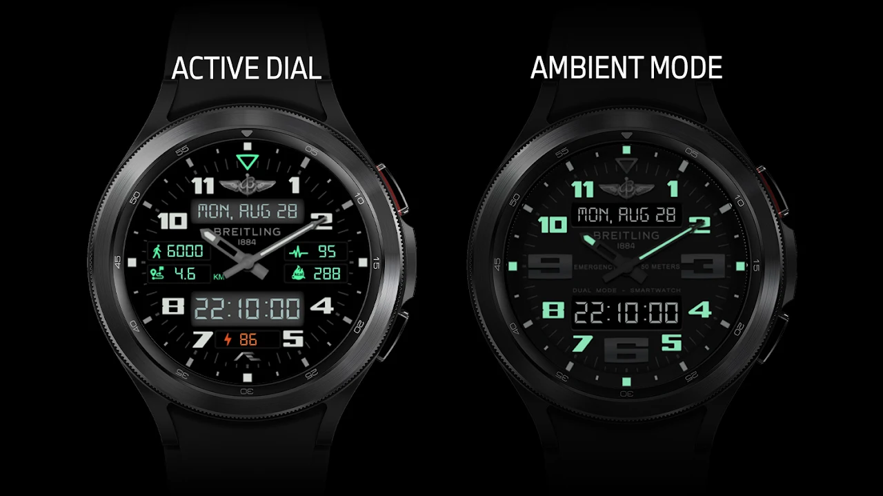 雙模式健康活動錶盤 靈感源自為收藏家精心打造的百年靈應急腕錶。毫無疑問,這個虛擬複製品永遠不會代表百年靈的精湛工藝,充其量這是智能手錶用戶在正式活動、鍛煉和/或參與體育活動時可以將百年靈固定在手腕上的最接近的方式。