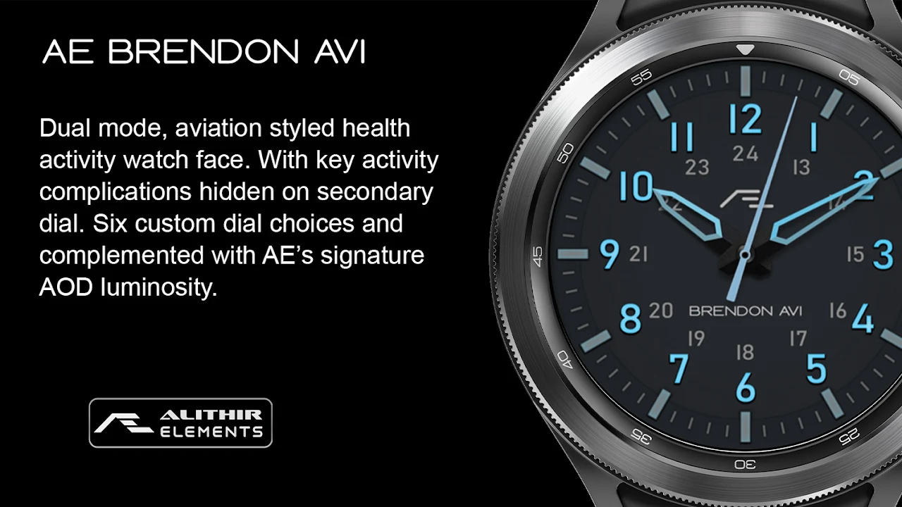 Dual mode, aviation styled health activity watch face. Key activity complications integrated in a realistic Subdial rendition, hidden away on a secondary dial. Six Main dial choices and two Active dial choices, sheer work of art that comes with AE’s signature Always ON Display (AOD) luminosity.