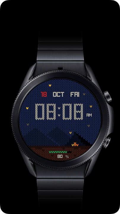 A Christmas-themed Wear OS watch face,The dial simulates the texture of the sweater fabric to create a Christmas night effect, with all elements present. Starlight and campfire twinkle