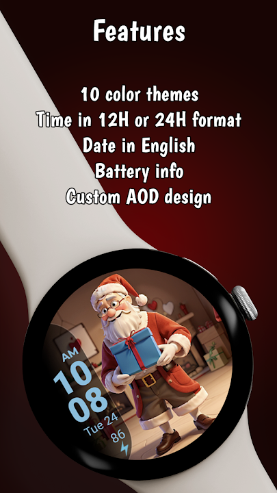 Embrace the holiday spirit right on your wrist with the Christmas Gift watch face for Wear OS! This festive watch face brings the joy of Christmas to your daily routine with a charming background image featuring Santa Claus holding a special gift, symbolizing the season of giving and joy. Personalize your watch face with 10 different color themes, each adding a unique touch to Santa's festive attire and the overall interface. The app has digital clock in 12 or 24H format, date in English language, a discreet and efficient battery level display and custom designed AOD.