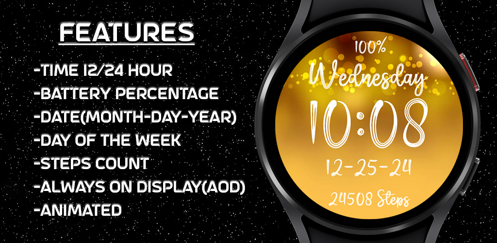 Christmas Gold Sparkle Glitter Watchface for your Wear OS smartwatch! Watchface is available on devices running Wear OS API level 28 and higher. English watchface only. Thanks and enjoy!