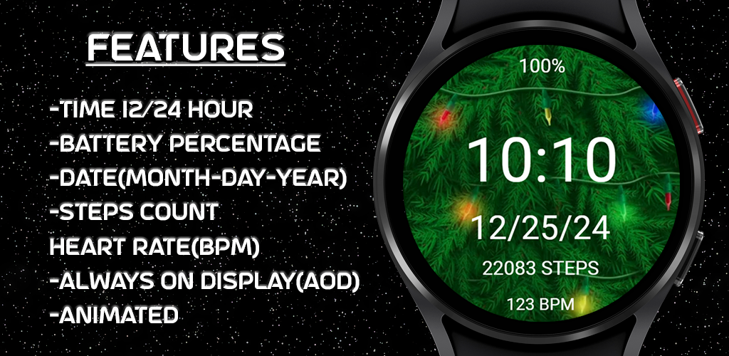 Animated Digital Christmas Tree Lights Watchface for your Wear OS smartwatch! Watchface is available on devices running Wear OS API level 28 and higher. Thanks and enjoy!