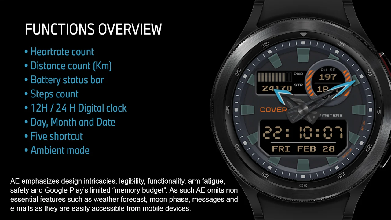 Evolved from the COVERT series watch faces, adding a Tactical version to the family. From the most popular AE COVERT FUSION, to a tactical styled health activity watch face. A timeless design enchants lovers of classic, tactical renditions.