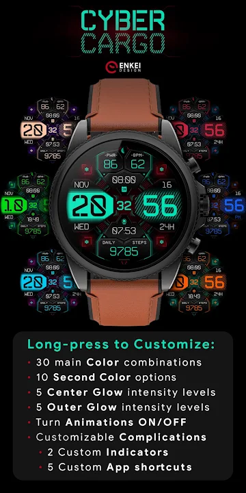 选择您喜欢的指示符、应用快捷方式,并组合您喜欢的颜色,创建独特的布局,彻底改变您的智能手表的外观和体验!
