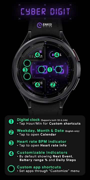 Cyber Digit is a high-tech retro digital watch face inspired by cyberpunk's colorful neon aesthetic, featuring customizable indicators and colors!