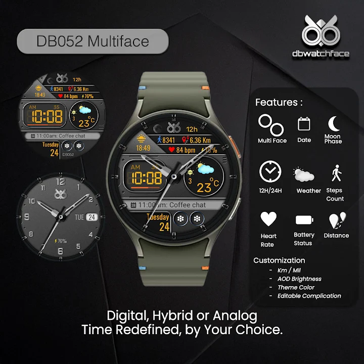 DB052 Multiface compatible with all Wear OS devices with API Level 34+ or Wear OS 5+ ( Samsung Galaxy Watch 4, 5, 6, 7 and others).