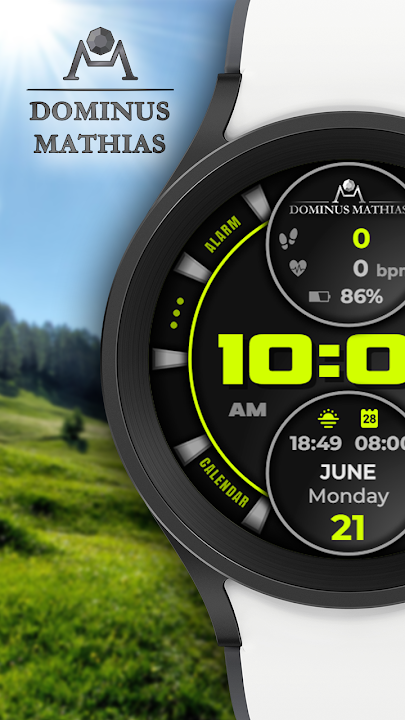 Customizable watch face by Dominus Mathias for Wear OS devices. It details all pivotal statistics, such as time, date, health records, and battery level. You have a selection of countless colors.