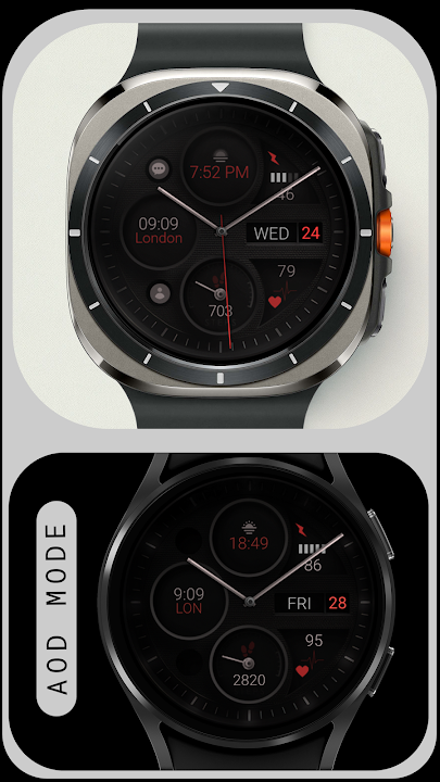 適用於 Wear OS 裝置的現代深灰色類比錶盤,將風格與功能融為一體。