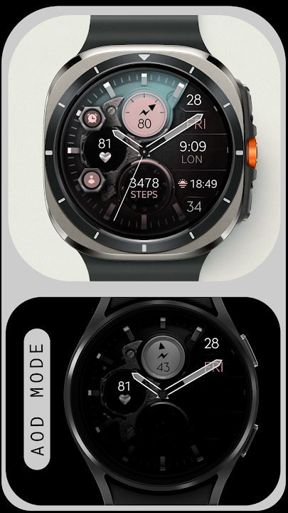 Bring a modern analog design to your Wear OS device. With metallic elements for a contemporary look, it suits any style. Customize colors to match your mood or outfit.