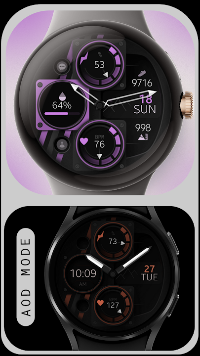 这款适用于 Wear OS 的混合表盘采用黑色和橙色设计,现代、大胆、时尚。通过自定义快捷键、颜色和复杂功能,它结合了智能手表的风格和功能。