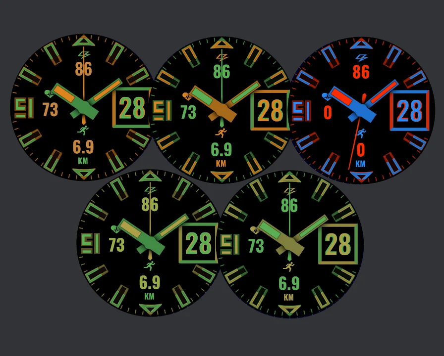 军用风格组合表盘。五种颜色选择。表盘特点:有关时间、脉冲、距离和电池电量的信息。经济、信息丰富的AOD模式。- 多变的颜色。仅适用于搭载 Wear OS 的手表。