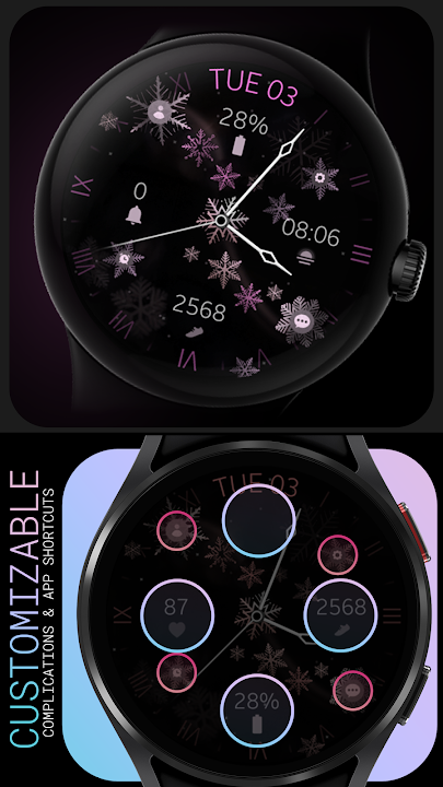 用適用於 Wear OS 的優雅雪花模擬錶盤來慶祝冬季。這款錶盤採用時尚的黑色背景,點綴著精緻的雪花圖案,將優雅與個性化設計完美融合。包含自訂應用程式快捷方式、複雜功能和可更換顏色,為您帶來個人化時尚的體驗。