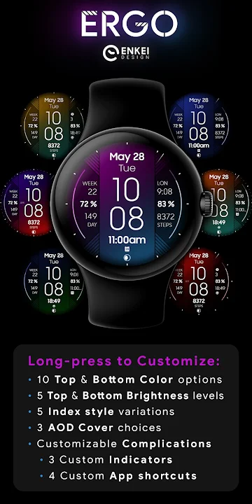 ERGO is a unique modern digital watch face, offering a wide range of color customization with beautiful gradients which meet in the middle and create some gorgeously unique color combinations!