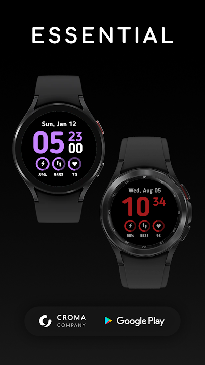 Essential for Wear OS 包含所有有用的信息,例如电池电量、每日步数和心率(范围和值)。日期显示在表盘顶部。在设置中,可以在 10 个可用颜色主题中选择颜色主题,并设置两个位于分钟和步骤上的自定义快捷应用程序。