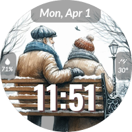 EXD032:Wholesome 錶盤是一款專為 Wear OS 設計的數位手錶,融合了經典和現代功能。它以12 小時和 24 小時格式顯示時間,以滿足使用者的喜好,並包含日期功能以增加便利性。錶盤設計有兩種可自訂的複雜功能,讓使用者可以透過選擇與他們最相關的資訊來個性化他們的體驗。 始終顯示功能確保時間和重要資訊一目了然,無需啟動螢幕。錶盤的背景描繪了一對老夫婦在冬季坐在公園的長椅上,喚起一種溫暖和懷舊的感覺。這種藝術表現不僅增添了美感,也與永恆的愛與陪伴的主題產生了共鳴。總體而言,EXD032:健康錶盤將功能性與溫馨的視覺效果融為一體,使其成為任何與智慧手錶相容的獨特配件。