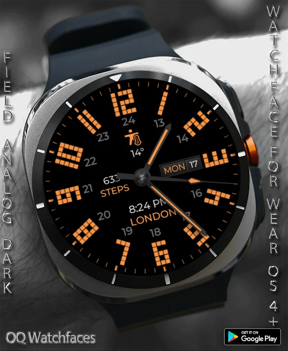 适用于 Wear OS 5+ 的 Dark Analog Field WF,提供多种颜色和自定义选项。