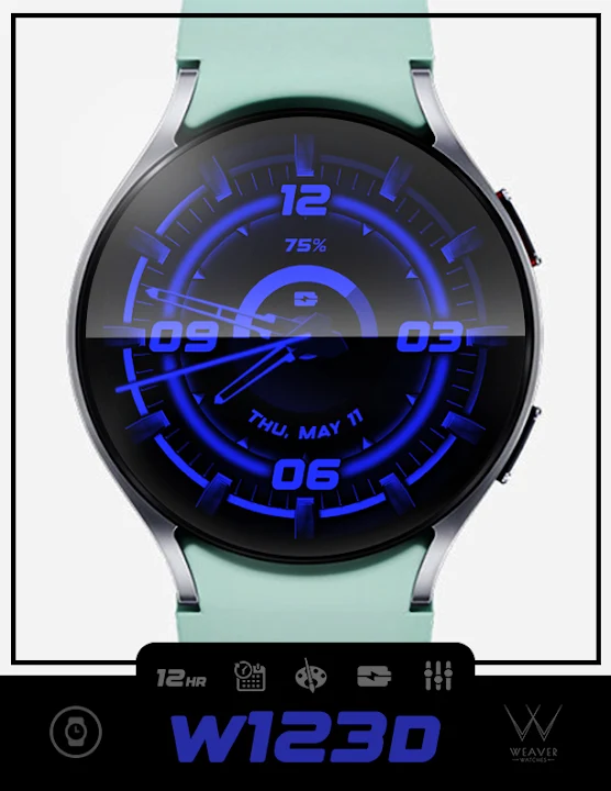 The W123D is a classic themed but artistic watch face that shows date & time and battery level. Multiple color options to choose from for Face Color and Hand Colors. Simplistic AoD analog time.