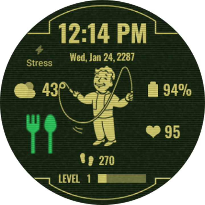 Watch face for Wear OS watches that shows a retro style screen and animations based on your heart rate and you will even level up based on steps. Color theme options available and multiple complication slots.