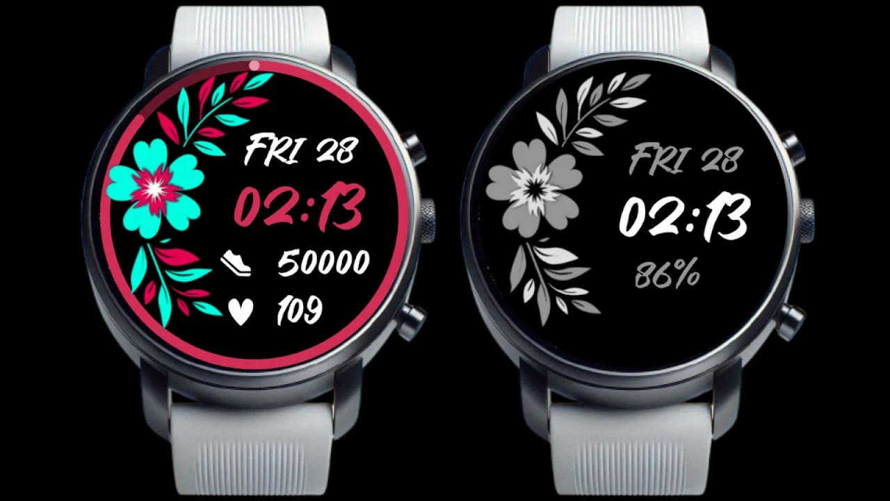 A beautiful floral design for Wear OS, with the option for 9 different color combos. Also shown at a glance with Digital Time, Date, Steps and Heart Rate. Battery progression is shown as the border color, also with animated dot representing seconds.