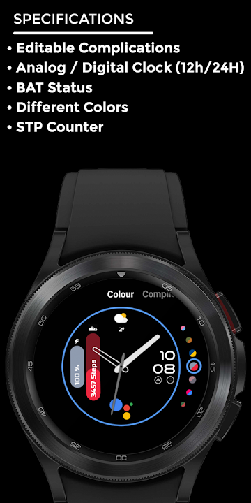 可编辑复杂功能、模拟/数字时钟、不同颜色、BAT 状态