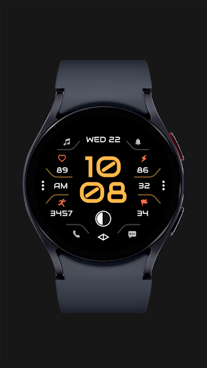 A stylish watch face with customization, health tracking, and shortcuts.