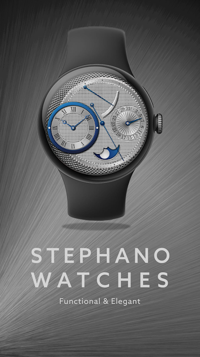 優雅的 Wear OS 錶盤特點:時間位於左側,電池儲備位於頂部,日期位於右側,月相位於底部。這款錶盤旨在模仿扭索飾紋錶盤,優先考慮現實主義和鐘錶設計線索。深色錶盤也可供使用者選擇。