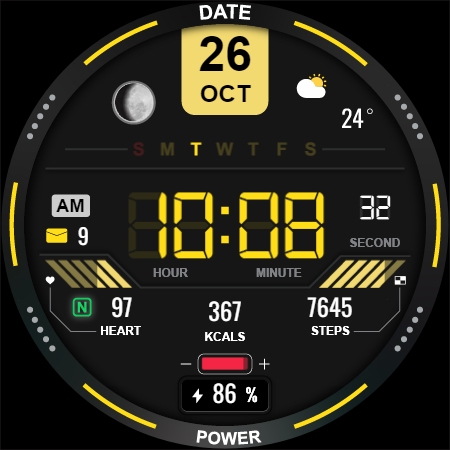 - 步數、心率、電池電量、卡路里、未讀取訊息、月相