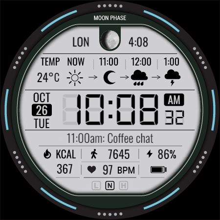 - 步數、心率、電池電量、卡路里、下一個活動、天氣預報
