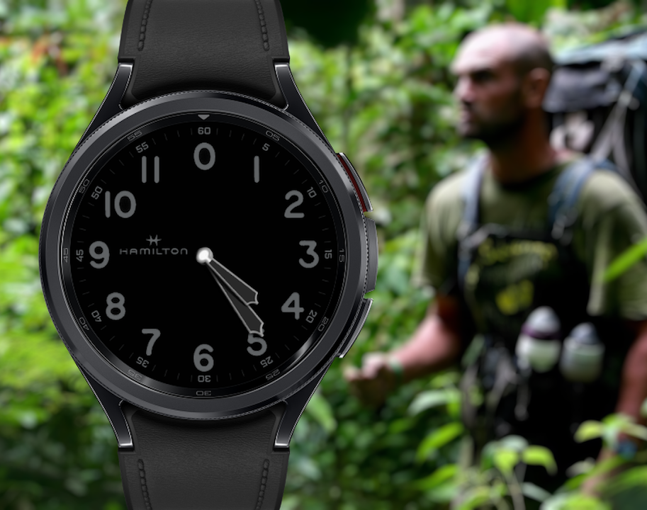 HAMILTON KHAKI is a analog watchface with a modern design that looks amazing on your wrist. Decorative elements give the dial a unique look.
