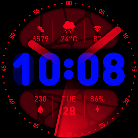 这款 Wear OS 表盘拥有您所需的一切 - 数字时间、日期、电池电量、心率、步数、天气信息和多种颜色选项。