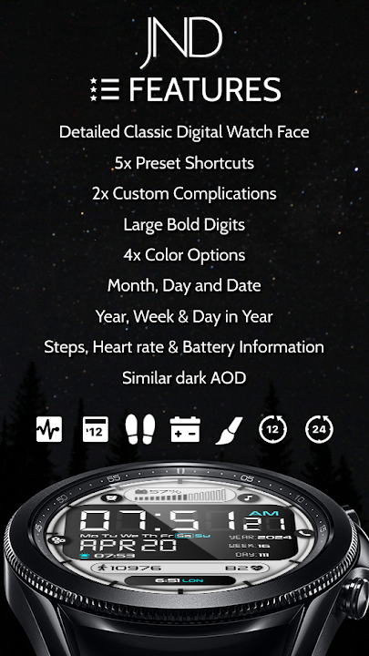 The JND0048 is a High Quality Classic Looking Digital Watch face for Wear OS.