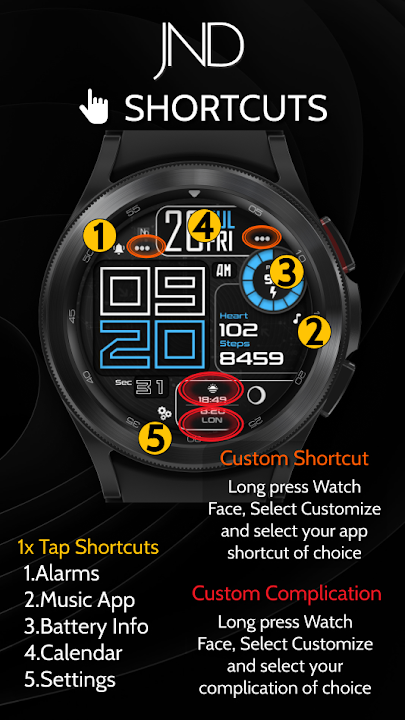 The JND0053 is a modern looking digital watch face with easy to read digits and an OLED friendly dark design. Features include, 6x Color Options, 5x Shortcuts, 2x Customizable shortcuts, 2x Customizable complications, Battery, Moon Phase Info, Date, Steps & Heart rate.