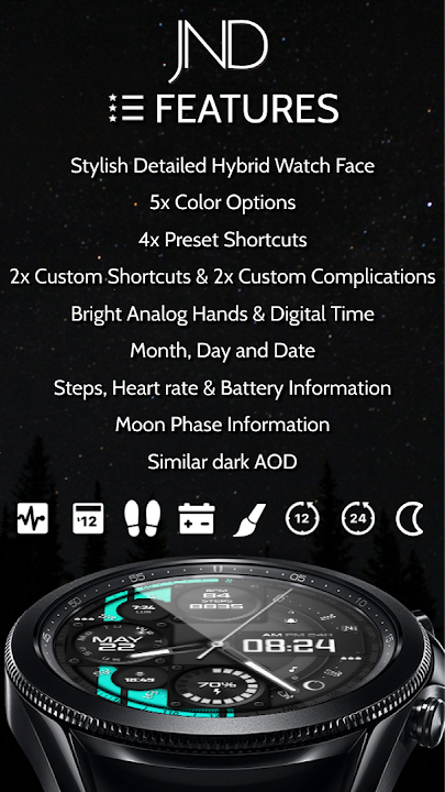 The JND0055 is a modern looking hybrid watch face with bright analog hands and time in digital format as well. High quality, stylish and detailed looking. Features include, 5x Color Options, 4x Shortcuts, 2x Customizable shortcuts, 2x Customizable complications, Battery, Moon Phase, Date, Steps & Heart rate.
