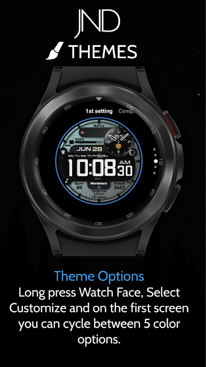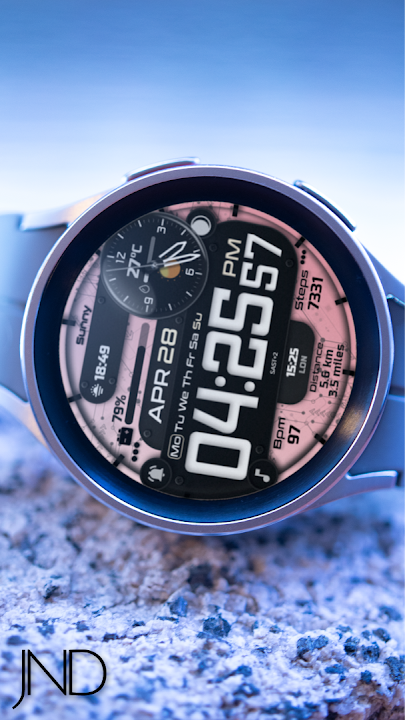 The JND0098 is a high quality modern hybrid watch face with a lot of customization options and a detailed stylish design. Features include, 5x Color Options, 4x Shortcuts, 2x Customizable shortcuts, 2x Customizable complications, Analog dial, Battery, Date, Time Zone, Weather Type, Moon phase, Current Temperature, Precipitation percentage, Distance, Steps & Heart rate.