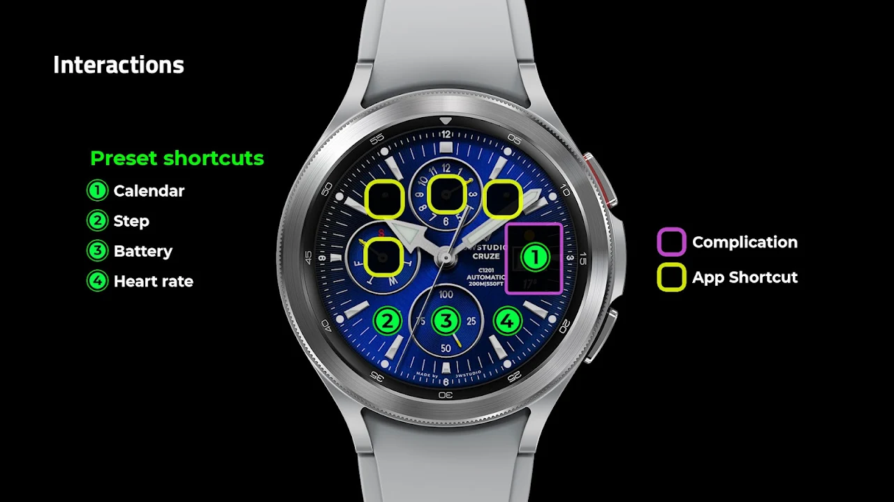 This watch face supports all WearOS 5 devices with API level 34 or higher, such as Samsung Galaxy Watch 4, 5, 6, 7, 8, Pixel Watch, etc.