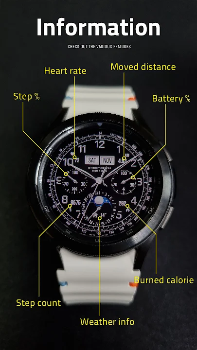 该表盘支持所有 API 级别 34 或更高的 WearOS 5 设备,例如 Samsung Galaxy Watch 4、5、6、7、Pixel Watch 等。