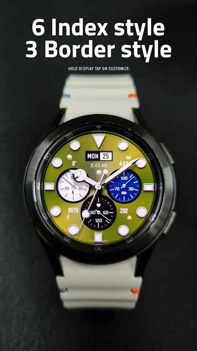 +++++++++++++++++++++++++++++++++++++++++++++ 【功能】 - 22種背景顏色 - 6種索引樣式 - 3種邊框樣式 - 3種子錶盤顏色 - 7種指標樣式 - 公里/英哩變更 - 天氣資訊 - 全AOD顏色 [++++++ 4個鍵結程式可顯示++++++++++++++++++++ [自訂] 1 - 觸碰並按住顯示幕。