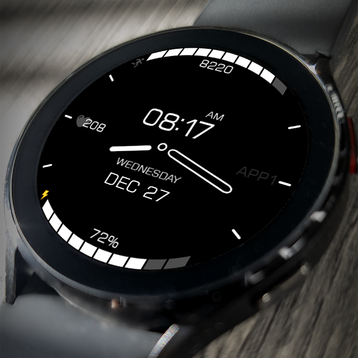 Key116 是一款适用于 Wear OS 的混合表盘,具有未来派设计,具有以下特点:
