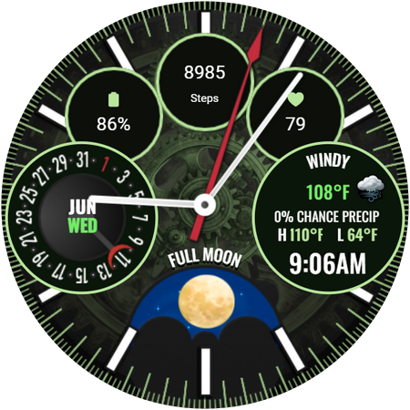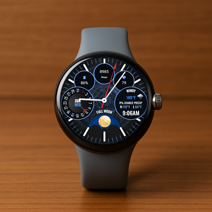 Stylish Wear OS watch face with rotating moon phase, live weather, and more!
