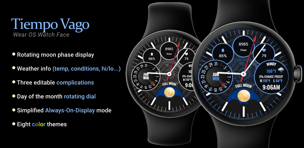 Elevate your smartwatch experience with Tiempo Vago, a premium Wear OS watch face designed for those who appreciate both elegance and functionality. With a dynamic rotating moon phase display and a clean, mechanical-inspired dial, Tiempo Vago offers more than just the time—it tells your story.