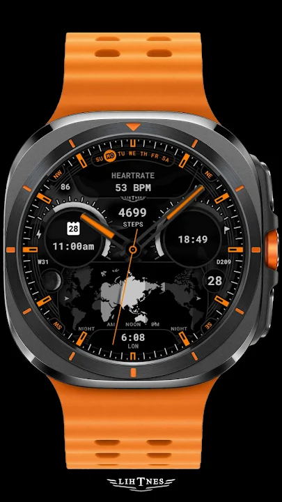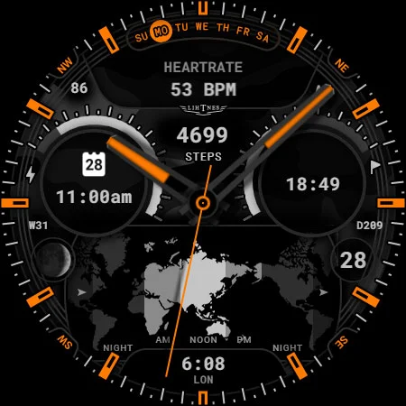 ✦ 動態世界地圖表盤:漂亮的模擬顯示屏,帶有實時晝/夜世界地圖,可根據您的位置和時間實時變化。