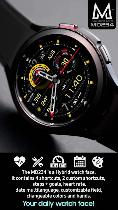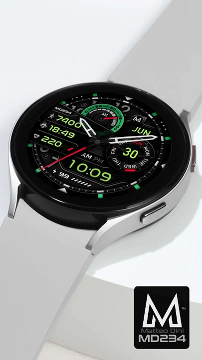 MD234 是一款适用于 Wear OS 的高级混合表盘,由 Matteo Dini MD 设计。
